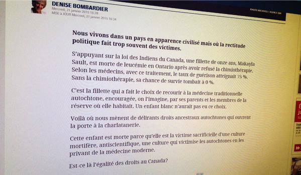 For those who cannot read French, a few of the highlights: After complaining about the cost of political correctness, she states that Makayla made the choice to be treated according to traditional medicine, encouraged, perhaps, by her parents and other members of her First Nation. Then the kicker, “A white child wouldn’t have to make this choice. This is where we see the delusional ancestral rights of the aboriginals open the door to quackery. This child died because she was the sacrifical victim of a deadly, anti-scientific culture that is killing aboriginal people.”