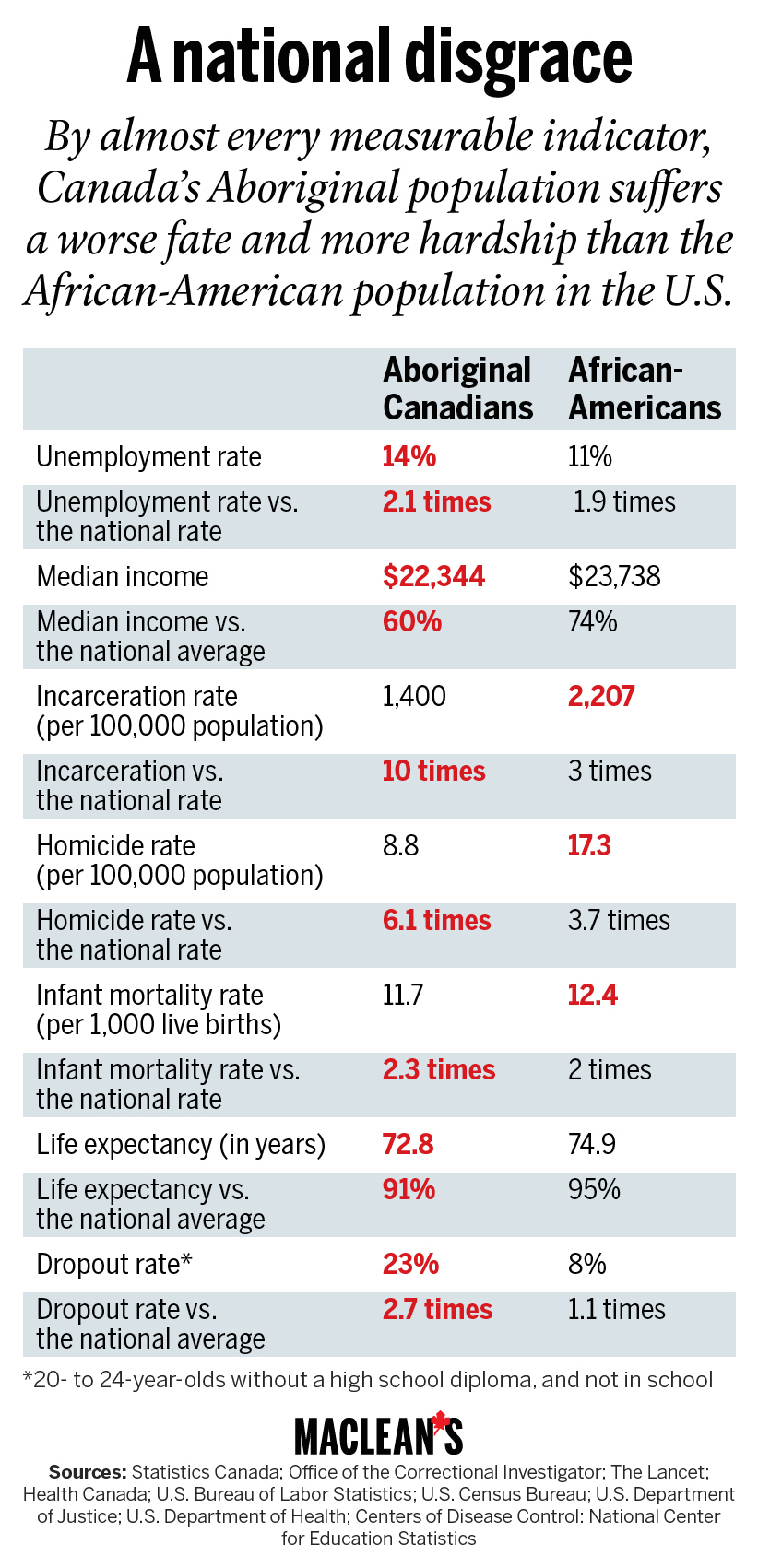 Gilmore pointed just how badly aboriginal peoples get screwed in Canada, by comparing them to African-Americans in the United States, in easy table format, which I produce here (and hope that MacLeans doesn’t mind). Look at those statistics and just try not to be offended, saddened, and, if you are Canadian, embarrassed. Hell, even if you’re American, you should be embarrassed by these stats. But, Gilmore’s right. Canadians are a smug lot. My Twitter feed is usually full of all kinds of anti-American comments, the implicit meaning is “Well, the US is a mess, thank god I live in Canada.” Information such as this should end such discussions and puncture our smugness forever.